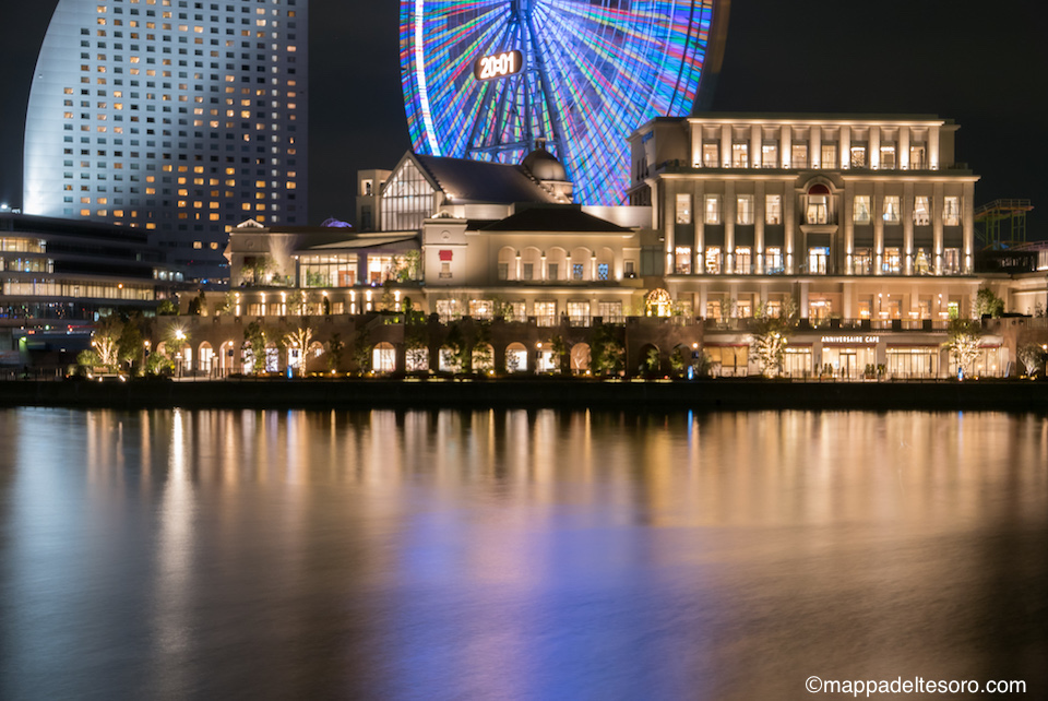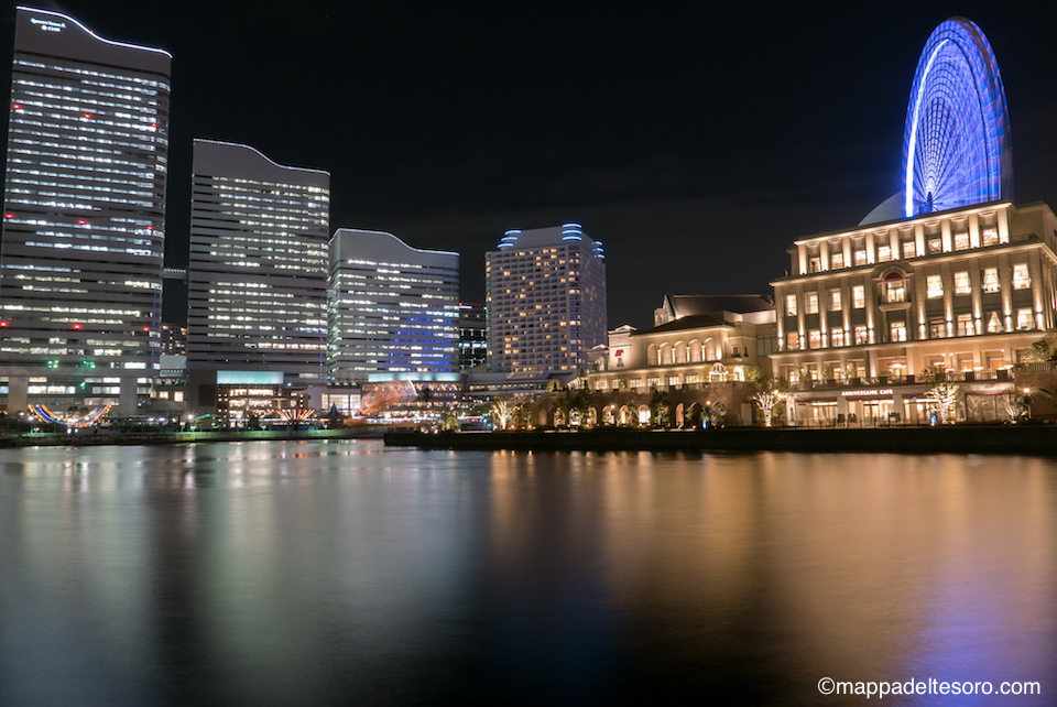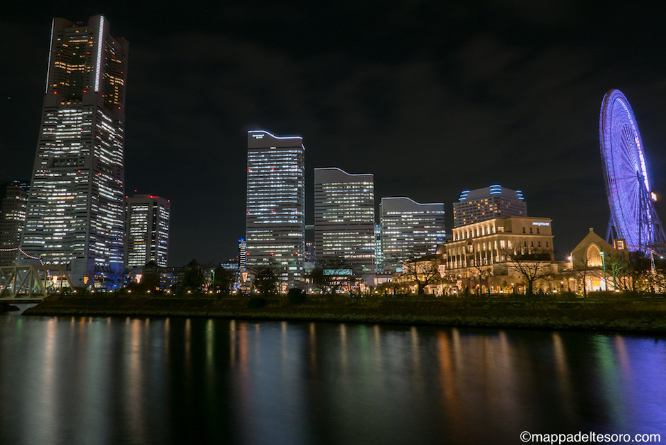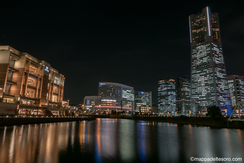 万国橋に向かう運河沿いからランドマークタワー、コスモクロックを見る。